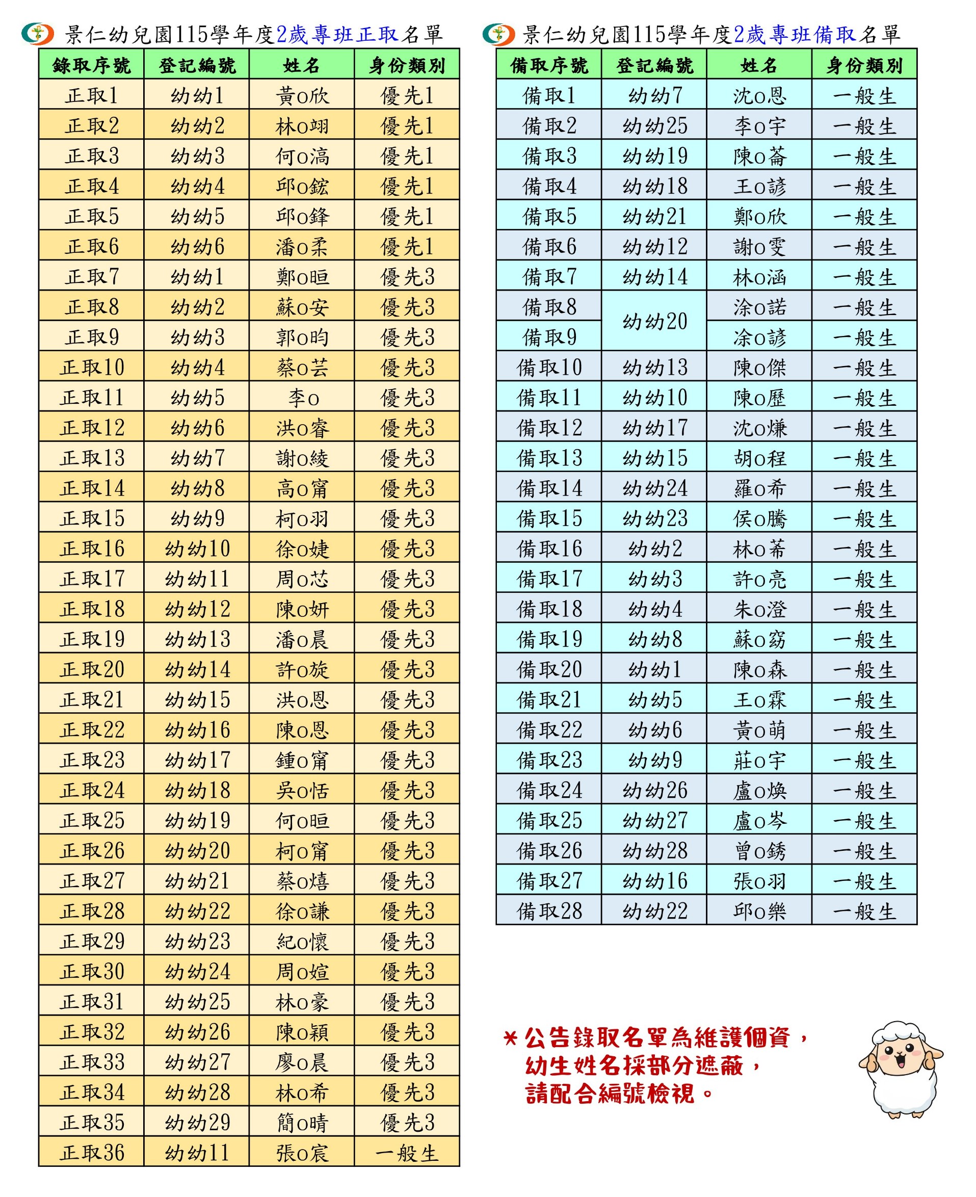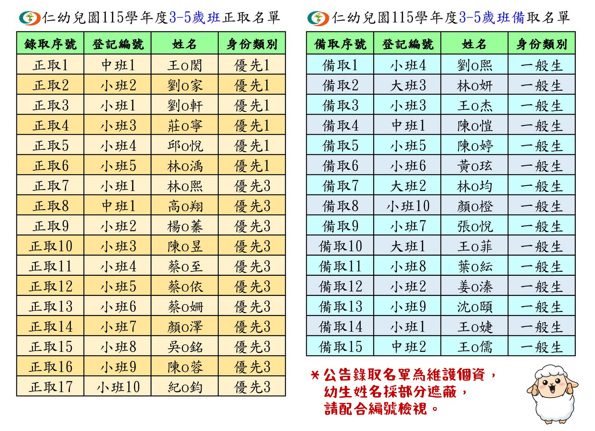 115學年度新生錄取名單公告